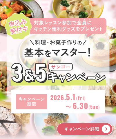 上級クラス開講を記念して、2026年5月1日より 『料理・お菓子作りの基本をマスター 3&5(サンゴー)キャンペーン』 を開催いたします。