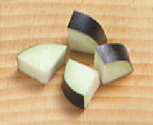 切り口の丸いものを縦十文字に切り、さらに端から切ります。イチョウの葉に似た形になります。