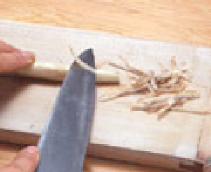 ニンジンやゴボウを鉛筆を削るように包丁の刃先を使って材料を回しながら薄く削っていきます。