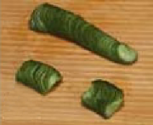 4〜5cm長さに切り、縦に1cm厚さに切り、横にして繊維にそって1cm幅の拍子木の形に切ります。