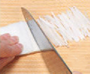 5〜6cmの長さにしてから縦にごく薄く切り、さらに重ねて細く切ります。