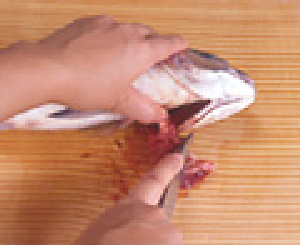 魚の腹を上にしてエラぶたを開き、包丁の刃先を入れ、 エラと身のつなぎ部分を切ります。反対側も同じように切り、エラを引っ掛けるようにして引き出します。