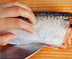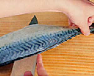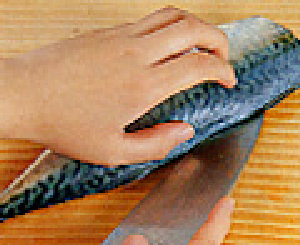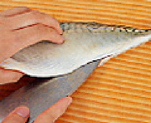 片手で尾を持ち、頭の方に向かって、身と中骨を一気に切り離します。