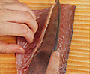 尾の方に逆包丁を入れ、付け根まで切ります。(皮の部分は尾についています。)