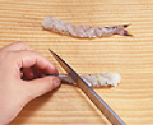 エビは加熱すると、背中を丸めた形に曲がるので、形よく仕上げるには、身の腹側に数ヶ所切り込みを入れた後、逆に背の方に軽く曲げましょう。